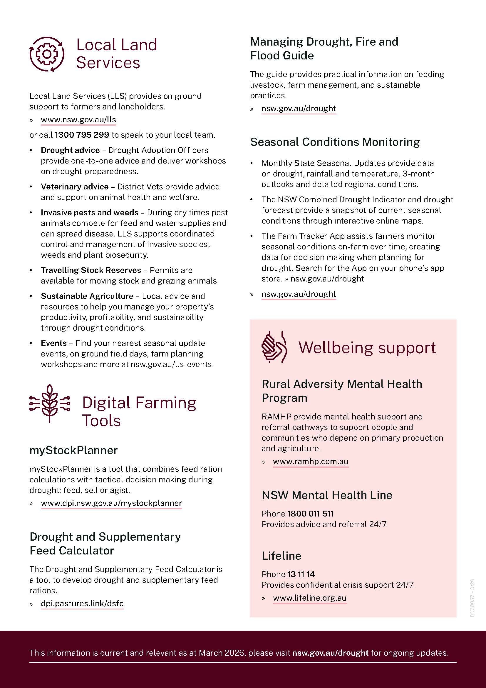Details of available business and financial assistance - Drought and supplementary feed calculator tools - Drought plan templates - Drought management guides - State seasonal updates.