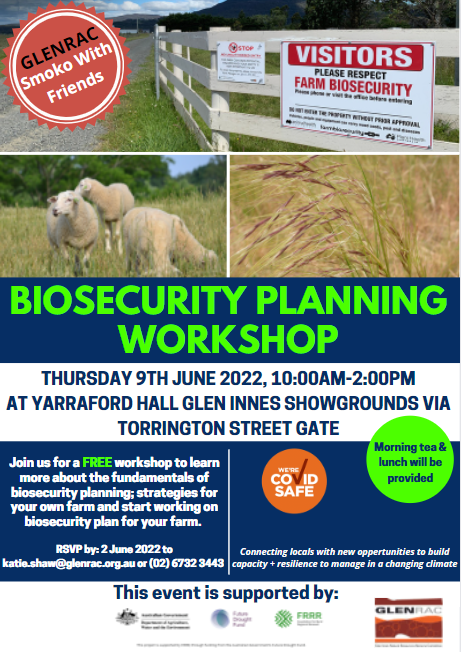 Back to All Events Biosecurity Planning Workshop Thursday 9 June 2022 10:00 14:00 Glen Innes Showgrounds (Yarraford Hall) Torrington Street Glen Innes NSW 2370 Australia (map) Google Calendar ICS Biosecurity Planning WorkshopThursday 9th of June 2022 10:00 am - 2:00pmAt Yarraford Hall Glen Innes Showgrounds Via Torrington Street Gate.Join us for Free Workshop to learn the fundamentals of biosecurity planning; strategies for your own farm and start working on a biosecurity plan for your farm.(Morning tea and lunch will be provided)RSVP by: 2 June 2022 to katie.shaw@glenrac.or.au or (02) 6732 3443. Download event flyer PDF