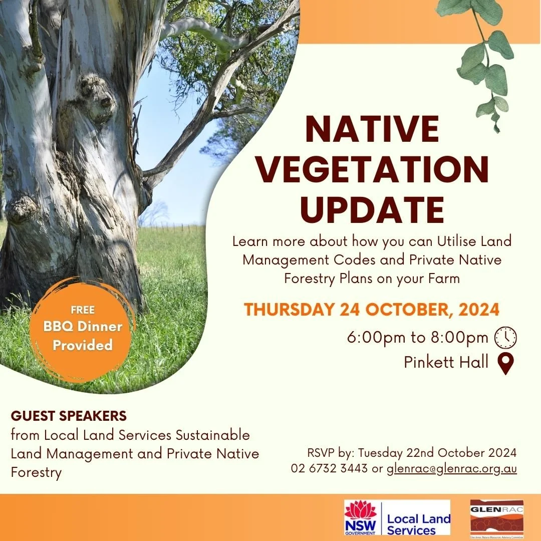 Back to All Events Native Vegetation Update Thursday 24 October 2024 18:00 20:00 Pinkett Hall Pinkett 2370 Australia (map) Google Calendar ICS Native Vegetation UpdateJoin us to hear from guest speakers from Local Land Services Sustainable Land Management and Private Native Forestry to learn more about how you can utilize land management codes and private native forestry plans on your farm. BBQ dinner supplied. RSVP by Tuesday 22 October 2024 or call 02 6732 3443 glenrac@glenrac.org.au Event Flyer PDF